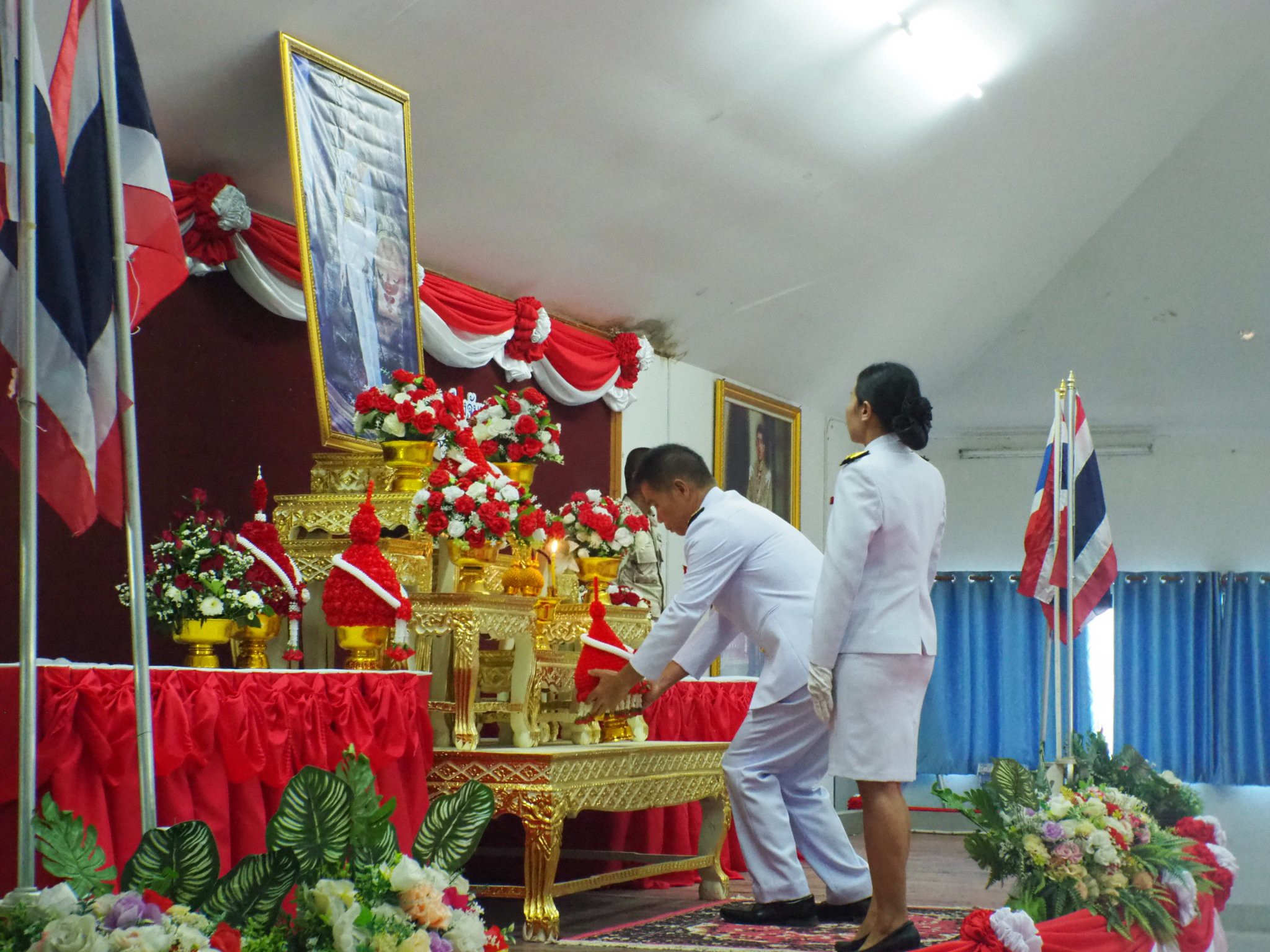 เวลา 09.00 น. ประธานในพิธีวางพานพุ่มดอกไม้ถวายราชสักการะ ณ หอประชุมอำเภอเมืองจันทร์